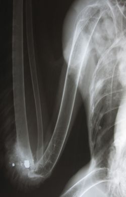 An x-ray told veterinarian Victoria Vosberg all she needed to know about this injured bald eagle, which was found by residents of a trailer park near the Indian River on May 16. The large white object is a bullet or pellet; the small white objects are fragments. The fuzziness around the image suggests an extensive infection. This female had a brood patch; she was likely nesting when she was shot. Raptor center staff were unable to save her.