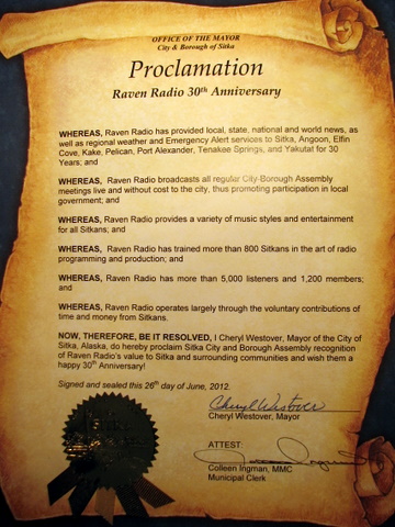The Sitka Assembly recognized Raven Radio’s 30th anniversary this Tuesday (6-26-12) with an official proclamation. The document cites the station’s news services to Sitka and surrounding communities, live assembly broadcasts, and “variety of music styles and entertainment for all Sitkans.” General manager Ken Fate accepted the proclamation on behalf of the station, along with his three predecessors. In his remarks, Fate outlined all that the station has accomplished for Sitka over the past three decades — and all the accomplishments to come!