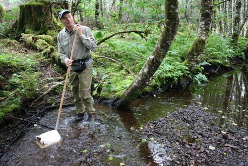 John Hudson does the “benthic dance” to loosen up a creek bed in the Starrigavan valley. Hudson works with the U.S. Fish & Wildlife Service in Juneau, and was one of Saturday’s “Bioblitz” group leaders. (KCAW photo/Ed Ronco)