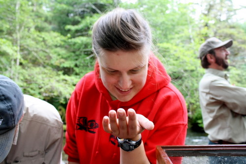 Sitka Tribe of Alaska weir manager and fisheries biologist Jessica Gill studies an aquatic invertebrate during Saturday’s “Bioblitz.” Gill was part of a team working in the Starrigavan Valley creek system. (KCAW photo/Ed Ronco)