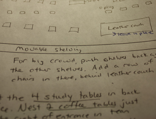 A diagram on the wall in Bell’s office shows how to rearrange the library furniture to accommodate large groups. Right now, events at the library often displace other patrons. (Photo by Ed Ronco/KCAW)