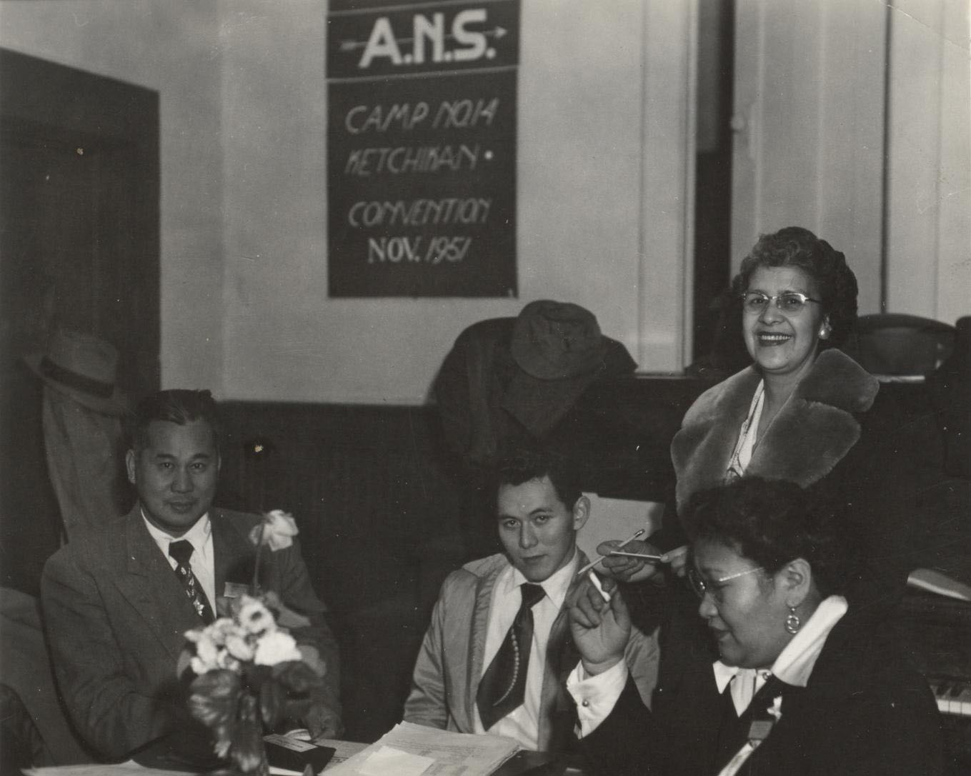 From left, George Miyasato, Richard Kito of Petersburg, Irene Inman and Marie James of Petersburg at the 1951 Grand Camp Convention in Ketchikan. Photo by William L. Paul Jr., courtesy Sealaska Heritage Institute.
