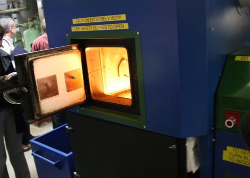 The door to one of Air Station Sitka’s wood pellet boilers is opened during a tour with U.S. Sen. Mark Begich on Saturday. The boiler immediately adjacent to this one exploded Wednesday, injuring a civilian contractor. (Photo by Ed Ronco/KCAW)
