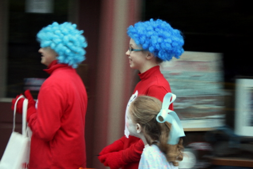 Sitka student Lily Hood makes her way downtown Wednesday evening (10-31-12) with fellow “Thing” Angelina Doggett and doll Addie Poulson during the Chamber of Commerce Trick-or-Treat event. The two-hour candy giveaway has become a Sitka institution. Hundreds of monsters, princesses, and spidermen freely roamed two blocks of Lincoln St. with their parents. But readers of Dr. Seuss know that of all of these creatures Things 1, 2, and 3 are by far the scariest!
