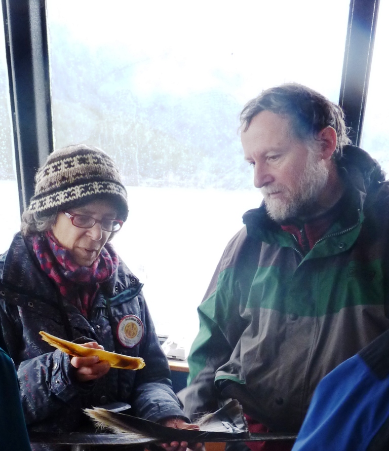 Samples of baleen are examined during a Nov. 3 whale-watching tour. Baleen filters krill and small fish from sea water. Photo by Ed Schoenfeld.