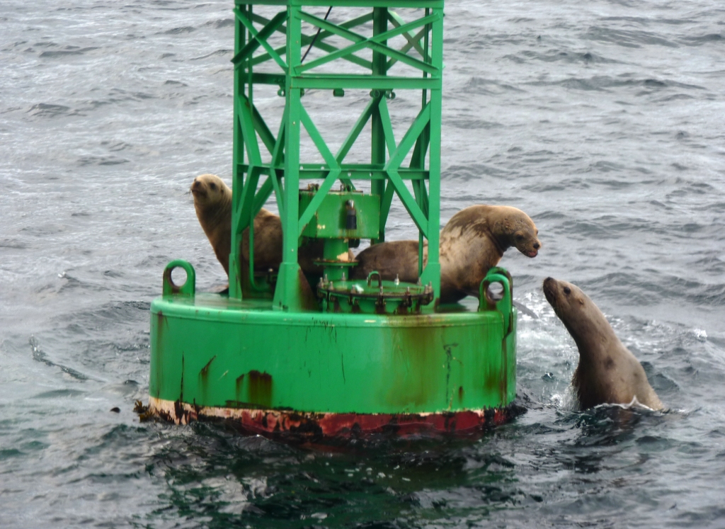 Sea lions touch noses as one clambers onto a buoy near feeding whales in Sitka Sound. Sea lions follow humpbacks, eating herring stunned or killed during feeding. Photo by Ed Schoenfeld.