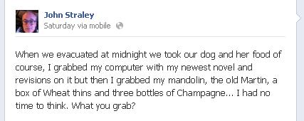 And within minutes, his friends – also awake, also rattled, also fresh home from the evacuation centers or hillside homes of friends – began to comment. Guitars, cameras, guns, ammo, food, pets, important documents, photos. One said she brought her knitting bag, in case it was a long night.