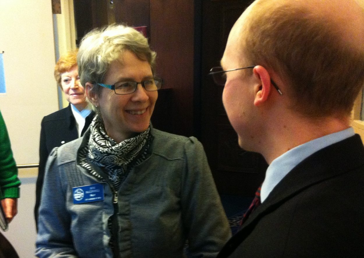 Sitka Mayor Mim McConnell runs into state Rep. Jonathan Kreiss-Tomkins (D-Sitka) in the main stairwell at the Alaska Capitol on Thursday morning. In the background is Marlene Campbell, the city’s government relations director. (KCAW photo by Ed Ronco)
