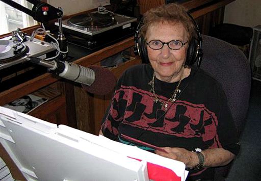 Freda Aron around the time of her 90th birthday, broadcasting another installment of the weekly “Frankie and Freda Show” on Raven Radio.
