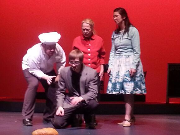 Ed Ronco, Ryan Apathy, Annabel Lund and Sotera Perez rehearse “Philip Glass Buys a Loaf of Bread.” (Photo by Karren Upcraft)