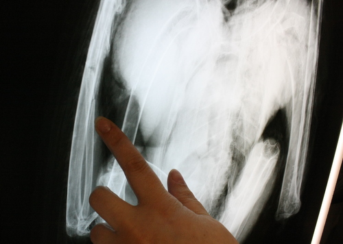 Cedarleaf positions Windex on a table and we hide behind a lead screen as the bird is zapped by X-rays. When the film is developed, we see a small little fracture on one of the bones in his wing.