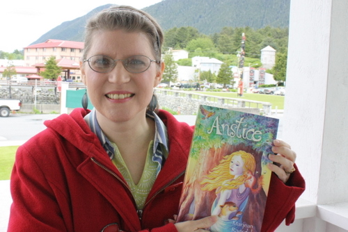 Sitka resident Marjean Ragsdale poses with her book, “Anstice.” The cover was designed by Sitka artist Jessica Lynn Clark. (KCAW photo by Ed Ronco)