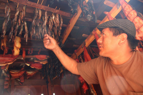 Jason Aceveda shows off hooligan, salmon, halibut and seal in the smokehouse at the 25th annual Culture Camp held this past week in Kake. (KCAW photo/Erik Neumann)