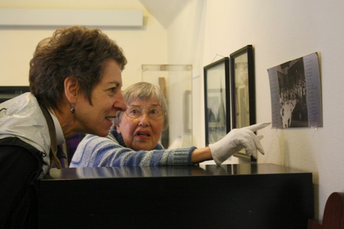 Nancy Ricketts shows the St. Peter’s By the Sea archives to Presiding Bishop Katharine Jefferts Schori, leader of the Episcopal Church in the United States. Ricketts’ father, Ed Ricketts, was one of the authors of “Between Pacific Tides,” a marine biology book Jefferts Schori used during her earlier career as an oceanographer. (KCAW photo by Ed Ronco)