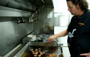 Chef Seth Caswell prepares grilled quinoa patties for the Sitka Seafood Fest this Friday and Saturday. Caswell is visiting Sitka from Seattle where he is Executive Chef at Google. (KCAW photo by Erik Neumnn)