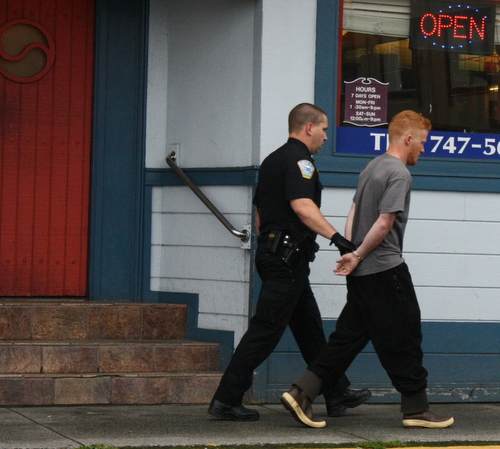 Tyler Westlund, 22, is taken into custody by Sitka police. Westlund is accused of running from the Pioneer Bar with a gun that had just been fired inside the bathroom. He’s charged with tampering with physical evidence. (KCAW photo by Ed Ronco)