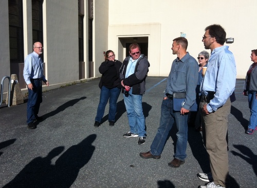 Interim Municipal Administrator Jay Sweeney updates employees after they evacuated City Hall when fire alarms sounded Friday afternoon. A drop in water pressure in the sprinkler system caused the alarms to sound. People were allowed back inside shortly after 4 p.m. (KCAW photo by Ed Ronco)