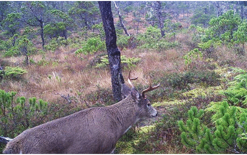 Few things warm the hearts of Sitka’s hunters like coming across a nice, fat buck in peak condition. Few things cool their enthusiasm like discovering a big brownie got there first! Hugh Bevan set up this trailcam “a couple of miles” from the beach on Kruzof Is. near Sitka. These two images (buck, then bear) were captured on October 18 and November 5 respectively. While the bear doesn’t look like she could hold another bite after the summer’s record salmon run, there’s no doubt that she’s interested!
