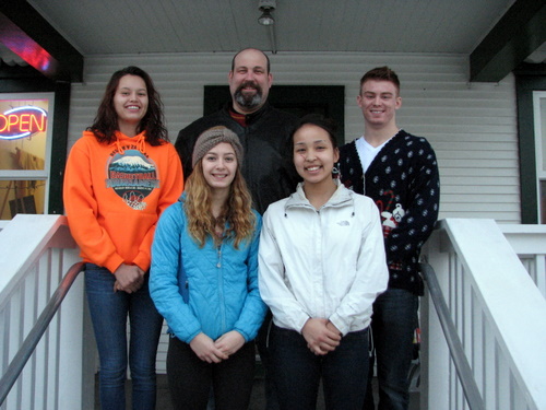 Mt. Edgecumbe wrestlers (l to r) Brittany Woods-Orrison, Deirdre Creed, Coach Mike Kimber, Miranda Johnson, and Jason Young.