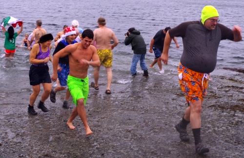 On Saturday (12-28-13) about 100 Sitkans took a swim without wet suits, dry suits, or survival suits — although one was in a Santa suit — in the Sitka Channel near the University of Alaska. The Annual Polar Dip was sponsored by the Sitka High School National Honor Society. KCAW’s Rich McClear was there and asked the only reasonable question a reporter could ask: Why?