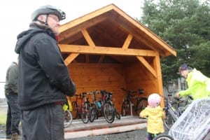 Now-retired high school wood shop teacher Randy Hughey built the bike shelter with his construction class last spring, after meeting a trained timber-framer who had stopped by the shop during an open house to admire some student furniture. Dan Sheehan had just moved to Sitka from Massachusetts.Hughey admitted to the small crowd gathered at the shelter’s dedication that becoming involved in forest policy was not exactly his top priority for working on the project.