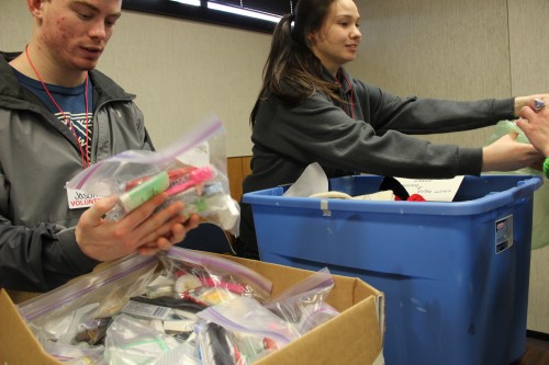Mt. Edgecumbe High School seniors hand out socks and toiletries at Project Homeless Connect. (KCAW photo/Emily Forman).