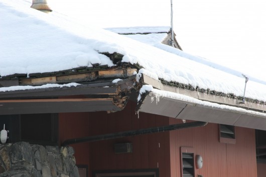A delivery truck apparently backed into the northwest corner of Kettleson Memorial Library on Monday, splintering part of the roof. (KCAW photo/Rachel Waldholz)