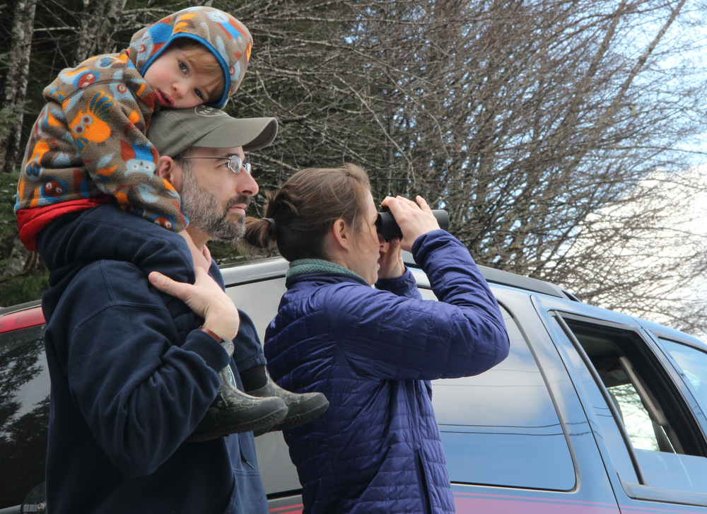 Eric and Erin Matthes brought their son, Ever, to join the dozens of Sitkans who lined Halibut Point Road to watch the opening of the sac roe herring season on Thursday (3-20-14). Ever is a true “herring baby,” said his parents. Born during herring season, he’ll turn three on Friday. (KCAW photo/Rachel Waldholz)