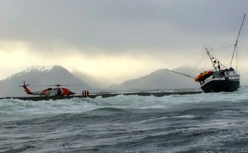 Kluting says the rescue boat was able to get within 50 yards of the Mirage while waiting for the helicopter, and stood by in the event the troller capsized or swamped and the two crewmen were forced into the water.