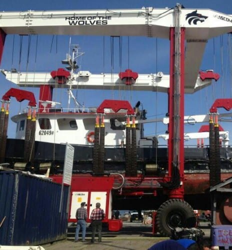 Wrangell’s new Ascom boat lift hauls the 98-foot fish-packer St. Jude out of the water May 24. (Delton Claggett /KSTK)