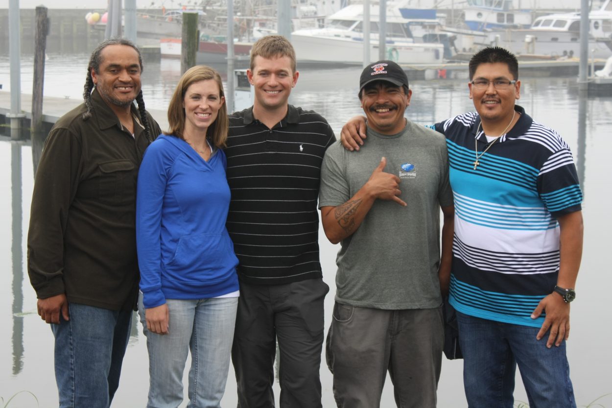 Leone and his wife, Ellen Leone, pose with his rescuers at the La Push Marina. From left, Darryl Penn, Ellen Leone, Lance Leone, Charlie Sampson and Levi Black. (Photo: Ed Ronco/KPLU)