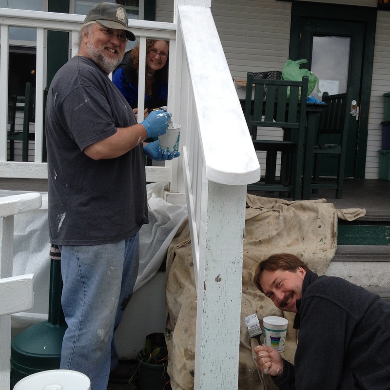 Board members Ted Howard, Perry Edwards and Roby Littlefield pitch in to paint the back porch of the Cable House. Despite offering passerby the opportunity to paint with us for a $5 fee – nobody did!