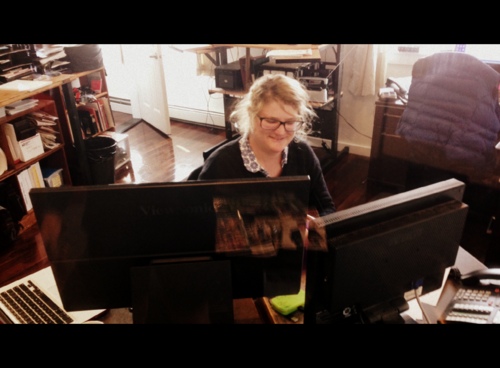 KCAW summer news intern Greta “Buzzsaw” Mart hard at work on her last day. (KCAW photo/Robert Woolsey)