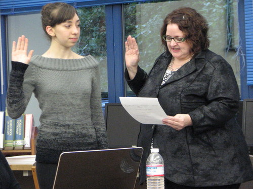 That’s Sitka school superintendent Mary Wegner swearing in senior Kaya Duguay as the student representative on the school board.
