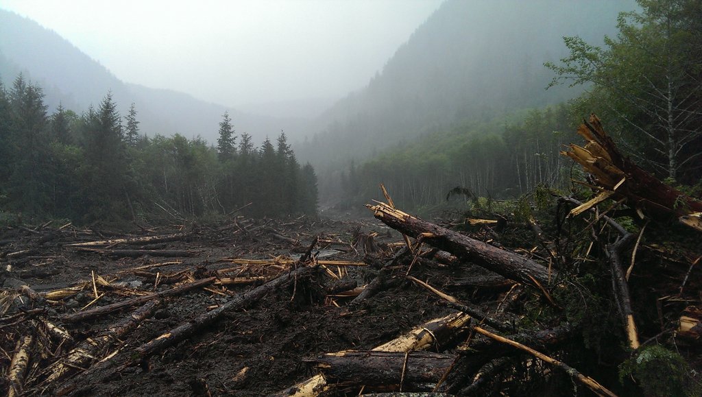 “And then one main slide that came down off the north-facing slope. Came down and ran about a third of a mile down the main channel, and ended up at the log stringer bridge, which hung up the main slide.”