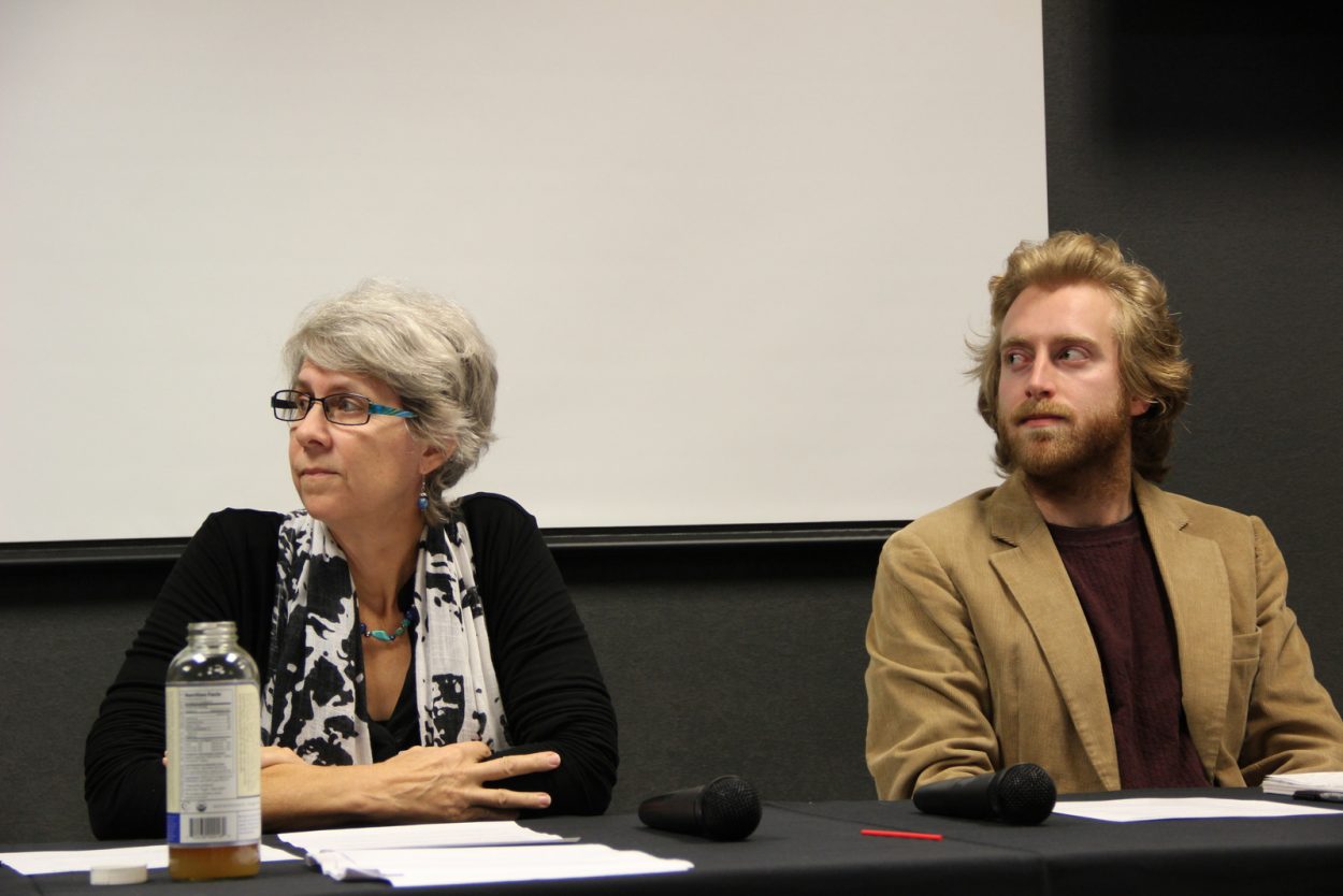 Mim McConnell and Orion Hughes-Knowles take questions at the Sitka Chamber of Commerce’s Mayoral Forum. (KCAW photo/Rachel Waldholz)