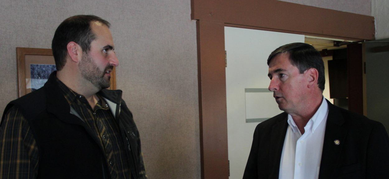 Steven Samuelson (left), Republican candidate for the Alaska State House, speaks with Anchorage Mayor, and candidate for Lt. Governor, Dan Sullivan. (KCAW photo/Rachel Waldholz)