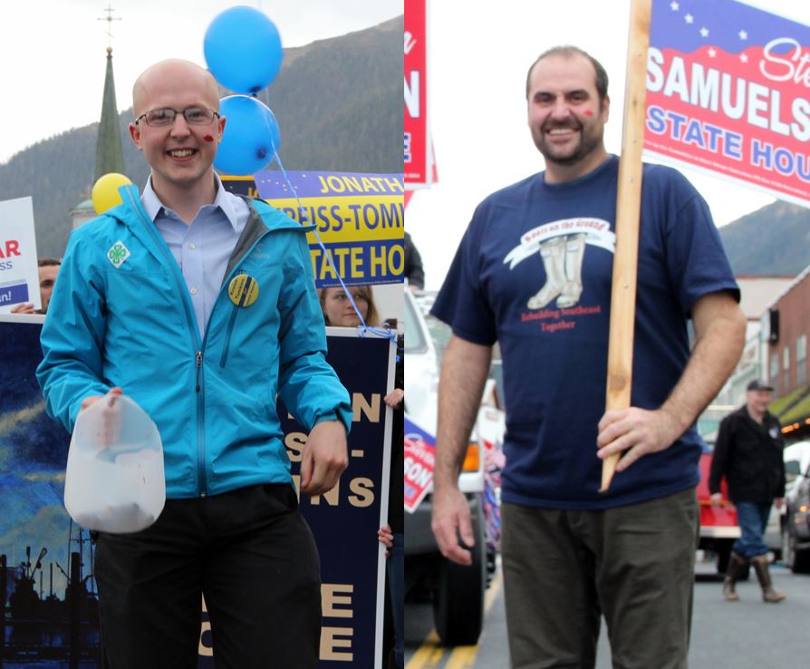 State House candidates Jonathan Kreiss-Tomkins, left, and Steven Samuelson, right, march in the 2014 Alaska Day Parade. Both addressed issues at a recent forum in Sitka. (KCAW photo/Rachel Waldholz)