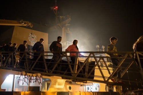 Guests descend the ramp of the Cutter Maple, a 225 buoy tender operated by the Coast Guard in Southeast waters (Mike Hicks/KCAW photo)