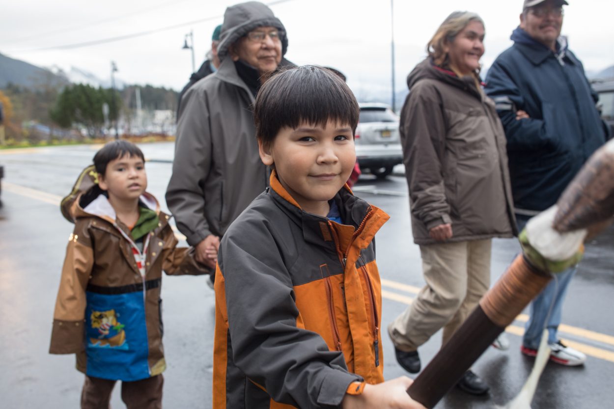 Rainy and Sunny McClenahan, a brother and sister duo, beat drums while leading the “Honoring Our Elders” parade. Also marching were current and former representatives from Alaska Native Brotherhood Camp #1, Alaska Native Sisterhood Camp #4, and the Sitka Tribe of Alaska Tribal Council. Amid overcast skies, the group marched from the Crescent Harbor Shelter to Sheet’ka Kwaan Naa Kahidi Tribal Community House, for a meet and greet for candidates for Tribal Council.