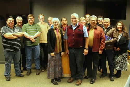 The Sitka Assembly and Sitka Tribal Council met on January 30, 2015. From left, Tribal Council member Wilbur Brown, Sitka Community Hospital CEO Rob Allen, Assembly member Aaron Swanson, Assembly member Matt Hunter, City Administrator Mark Gorman, Mayor Mim McConnell, Tribal Council member Bob Sam, Tribal Chair Mike Baines, Assembly member Michelle Putz, Assembly member Steven Eisenbeisz, STA General Manager Lawrence SpottedBird, Assembly member Tristan Guevin, Tribal Council member Harvey Kitka, and Tribal Council member Rachel Moreno. (KCAW photo/Rachel Waldholz)