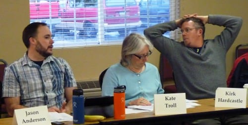 The Forest Service’s Jason Anderson, left, talks with fisherman Kirk Hardcastle, right, while Juneau Assemblymember Kate Troll reviews paperwork during the Tongass Advisory Committee meeting Feb. 17 in Juneau. (Ed Schoenfeld/CoastAlaska News)