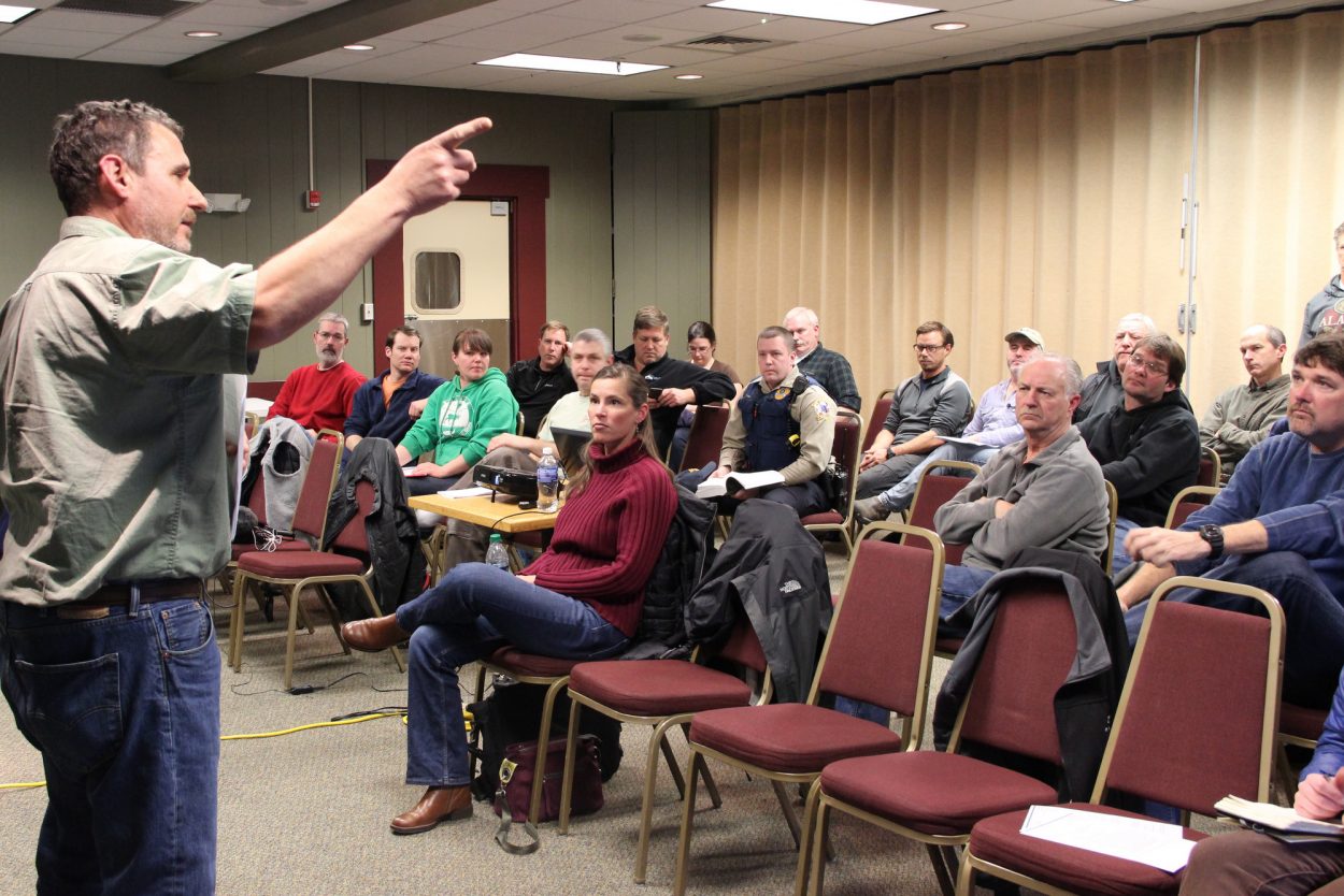 Permit-holders listen to ADF&G biologist Dave Gordon lay out how the 2015 herring fishery will work. This year’s fishery is being conducted as a co-op, so far fewer fishermen are in town. (Rachel Waldholz/KCAW)