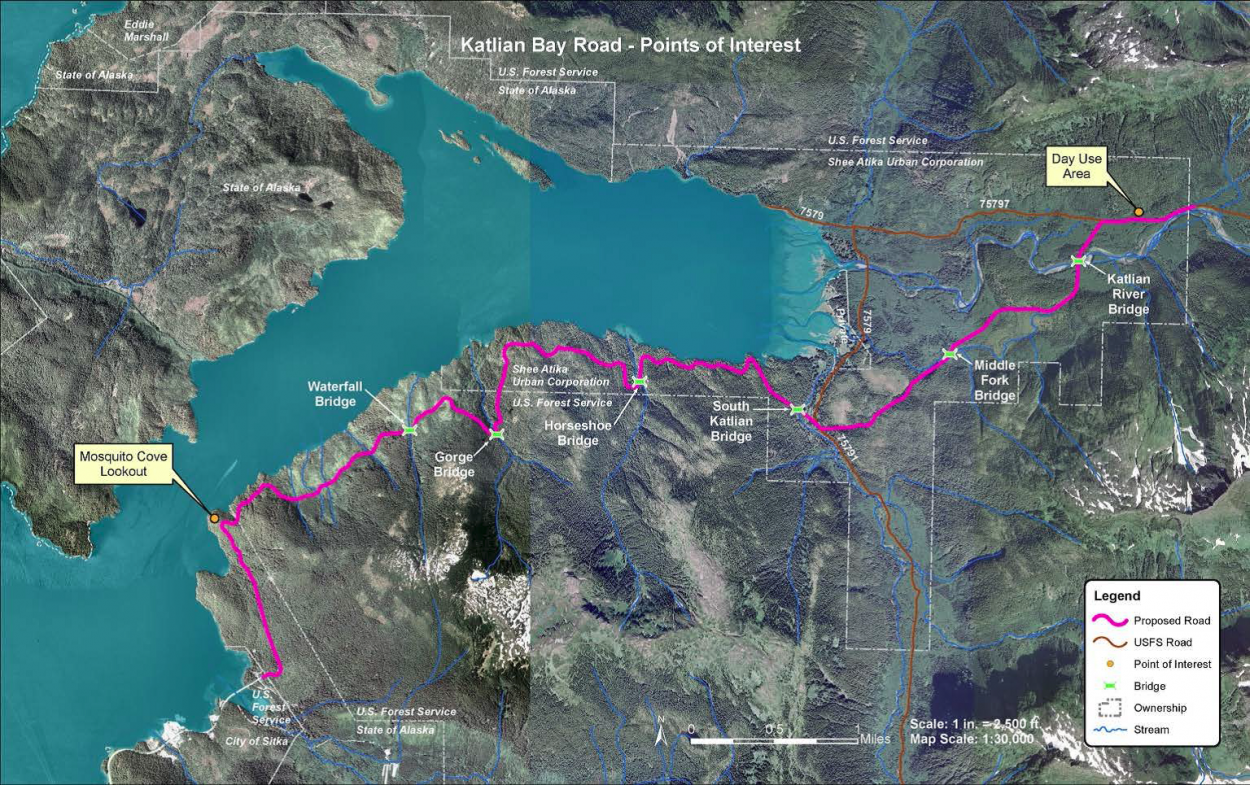 The road would run along the bay, with regular look-outs, and turnouts for vehicles to pass one another. It would end in a trailhead and day-use area, with parking and picnic tables, near the boundary between U.S. Forest Service and Shee Atika land.