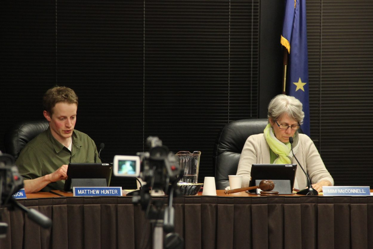 Deputy Mayor Matt Hunter and Mayor Mim McConnell during Tuesday night’s Sitka Assembly meeting. (Rachel Waldholz/KCAW)