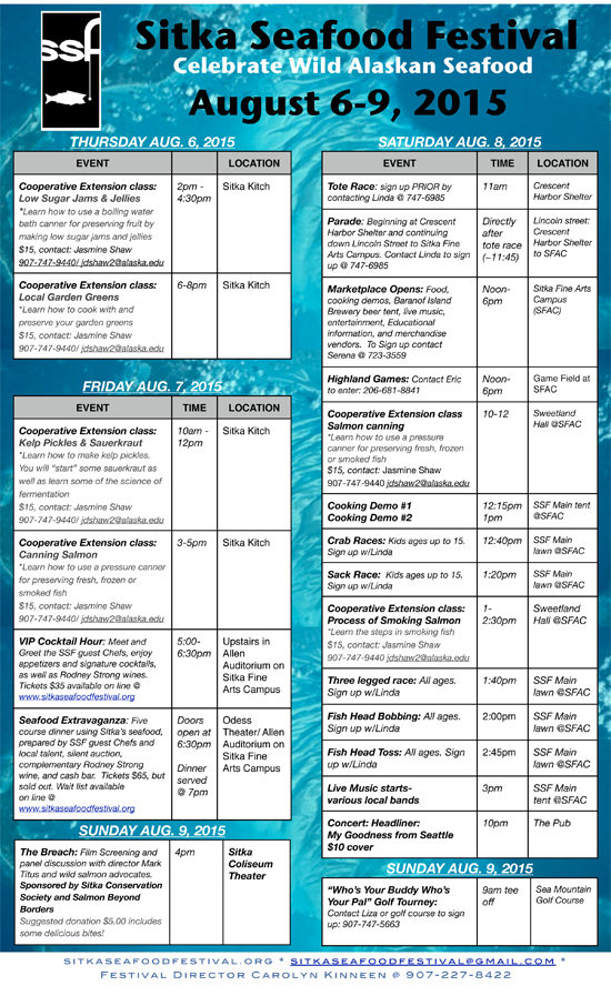 On Thursday and Friday, several cooking classes will be hosted by UAF’s Cooperative Extension at Sitka Kitch, including salmon canning and pickling. All of Saturday’s events are taking place at the Sheldon Jackson Campus, except for the tote race at Crescent Harbor Shelter. Advanced registration is required for the tote race and the parade by calling Linda at 747-6985. To register for the Highland Games, contact Eric at 206-681-8841.