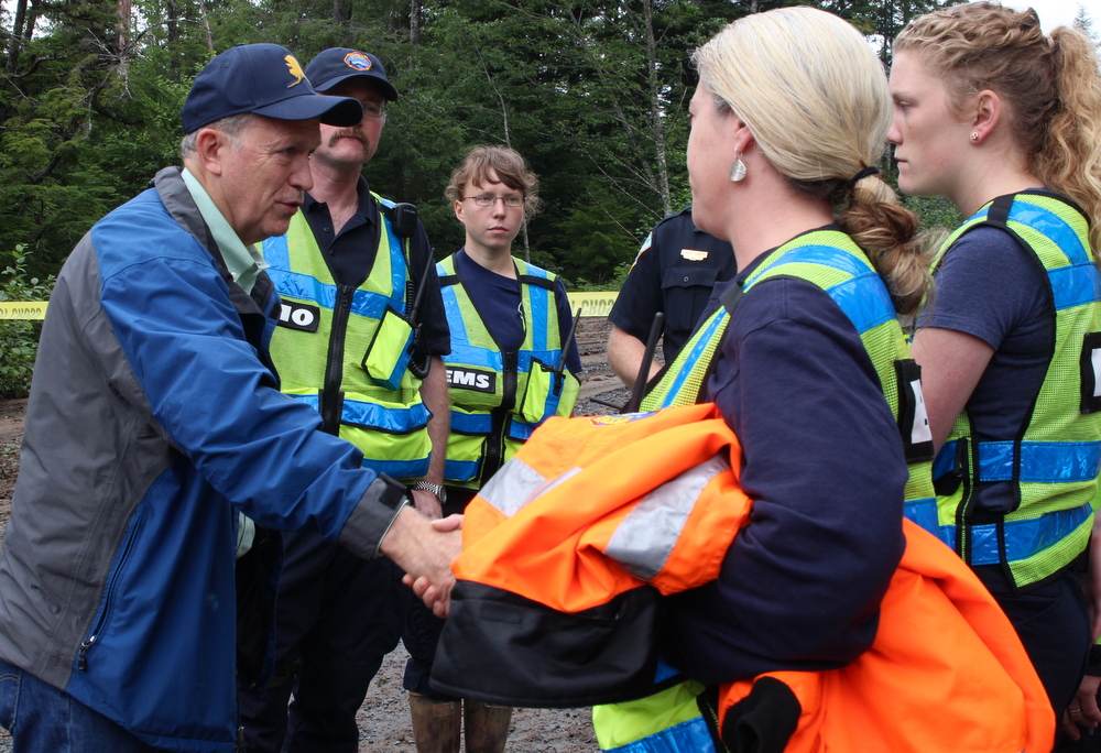 Alaska Gov. Bill Walker greets Kim Nekeferoff and other Sitka Fire Department personnel Tuesday morning. The Red Cross is helping organize meals for over 150 relief workers involved in the recovery. (KCAW photo, Rachel Waldholz)