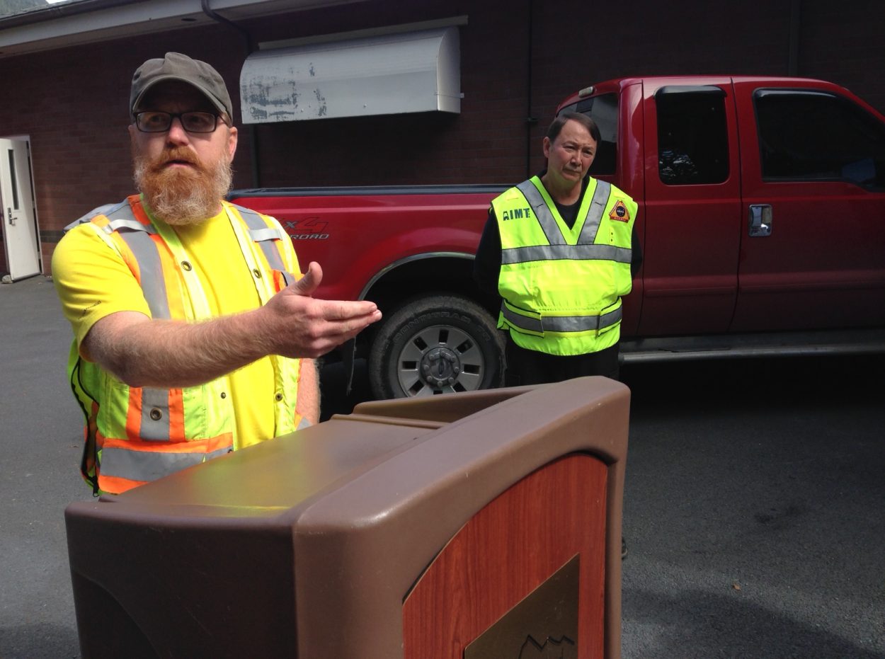 National Weather Service Meteorologist Joel Curtis (left) spoke with reporters Friday, along with DOT geologist Mitch McDonald and Deputy Fire Chief Al Stevens (right). (Robert Woolsey, KCAW)