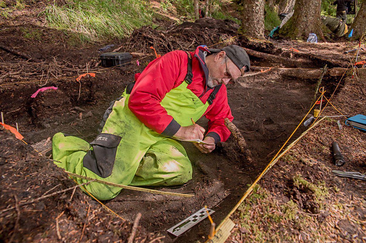 Dave McMahan, principal investigator for the Neva project, takes notes in a completed excavation block. (Photo credit: Gleb Mikhalev)