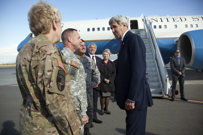 Secretary of State John Kerry arrives in Anchorage Aug. 30. Lt. Gov. Byron Mallott, in suit, and First Lady Donna Walker are among those greeting the secretary. (Photo courtesy Office of Gov. Walker)
